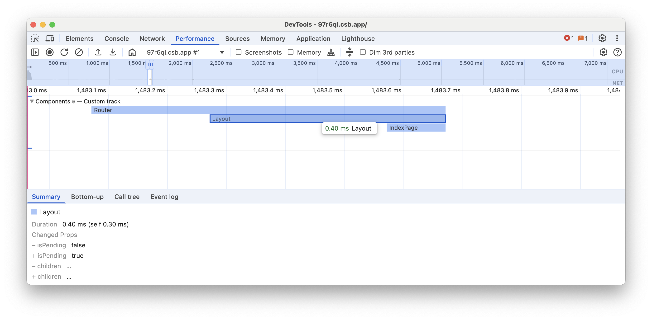 • Render - React renders the updated subtree by calling render functions of components. You can see the rendered components subtree on Components track, which follows the same color scheme.