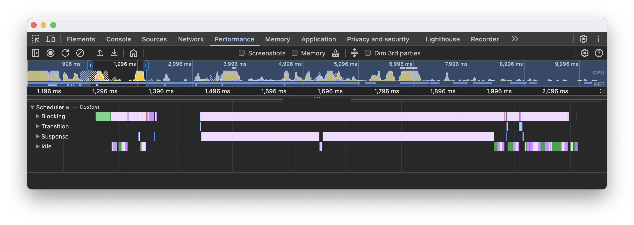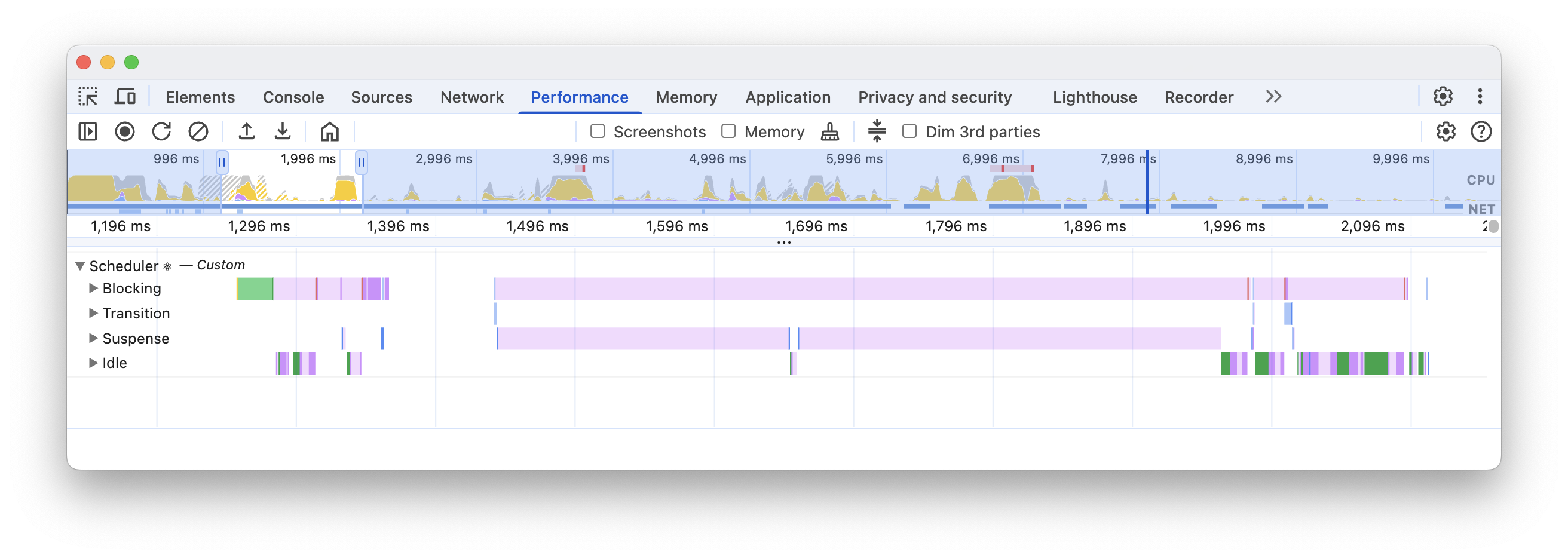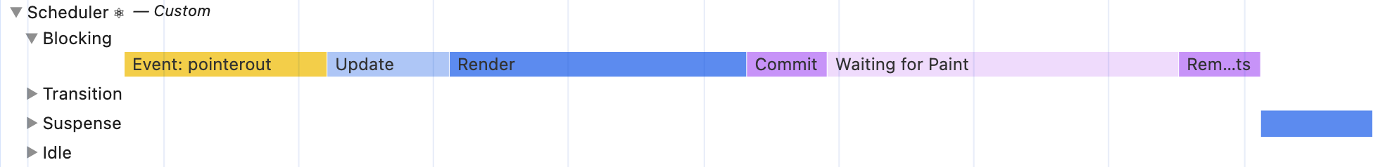 The Scheduler is an internal React concept used for managing tasks with different priorities. This track consists of 4 subtracks, each representing work of a specific priority: